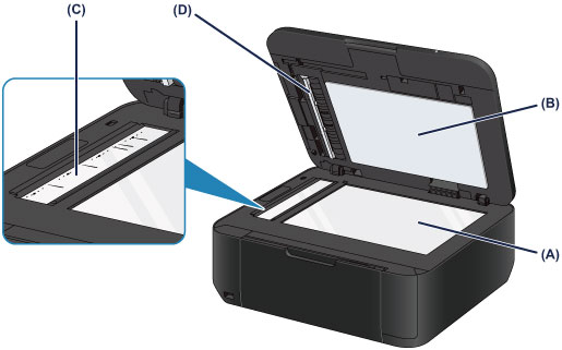 Stekleno ploščo (A), notranjo stran pokrova za dokumente (bela folija) (B), steklo ADF (samodejni podajalnik dokumentov) (C) in notranjo stran ADF (belo območje) (D) nežno očistite s čisto, mehko in suho krpo, ki ne pušča vlaken. Poskrbite, da na očiščenih površinah ne pustite nobenih vlaken, še posebej na steklu.
