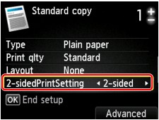 Ko izberete 2-stran. (2-sided) za Nast. 2-str. tisk. (2-sidedPrintSetting) v možnosti Standardno kopiranje (Standard copy), lahko kopirate dve strani izvirnika na obe strani enega lista papirja.