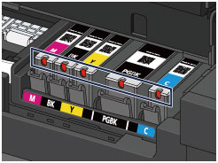 Įsitikinkite, kad rašalo talpykla įdėta tinkamoje vietoje, kaip parodyta spausdinimo galvutės laikiklio lipduke. Jei vieta tinkama, bet lemputė mirksi, įvyko klaida, dėl kurios įrenginiu negalima spausdinti. Perskaitykite LCD rodomą klaidos pranešimą.