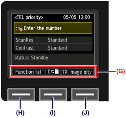 Na dnu zaslona se po potrebi prikažejo funkcijski meniji (G). Če pritisnete ustrezen gumb Funkcija (Function) (H), (I) ali (J), se prikaže njegova funkcija, kot je zaslon z nastavitvami.