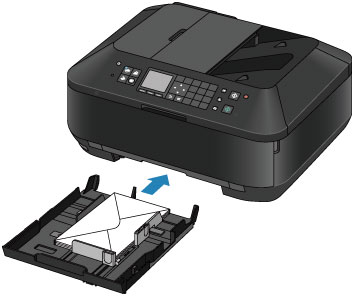 (3) Ovojnice naložite S STRANJO ZA TISKANJE, OBRNJENO NAVZDOL, in jih postavite na sredino kasete (spodnje).