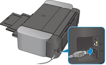 Prijunkite spausdintuvą prie kompiuterio USB kabeliu, kaip pavaizduota tolesniame paveikslėlyje. USB prievadas yra užpakalinėje spausdintuvo pusėje.