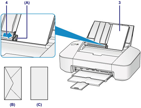 Nustumkite popieriaus kreipiklį (A) į kairę ir dėkite vokus palei tolimąjį dešinįjį galinio dėklo kraštą taip, kad SPAUSDINAMOJI PUSĖ BŪTŲ NUKREIPTA Į JUS.