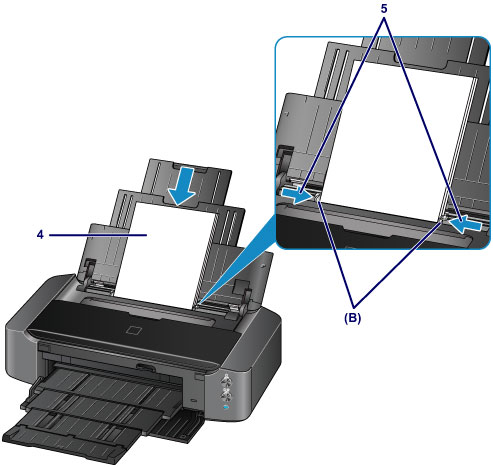 Potisnite vodili za papir (B), da ju odprete, in naložite papir v sredino zadnjega pladnja, tako da je STRAN, NA KATERO ŽELITE TISKATI, OBRNJENA PROTI VAM.