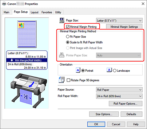 2Open the Print menu, then on the Page Setup tab of Printer Properties, select the Minimal Margin Printing checkbox, specify Minimal Margin Printing Method according to the media size for printing, and then click OK.