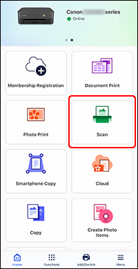 1Canon PRINT을 시작하고 스캔(Scan)을 선택합니다.