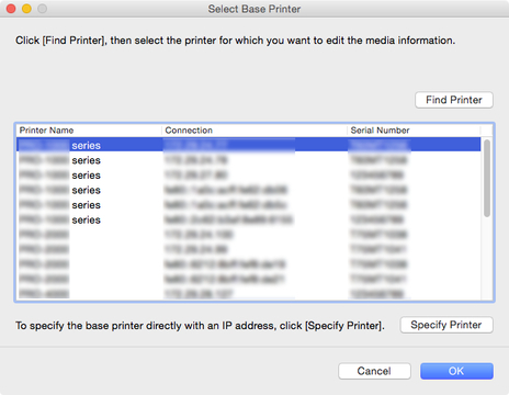 If the printer whose media information you want to update is not displayed, click the Find Printer button or the Specify Printer button to display the Specify Printer dialog box, and enter the printer IP address directly.