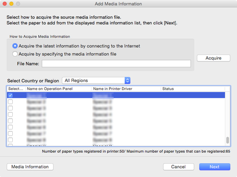 Specify the media information file that you obtained by selecting Acquire by specifying the media information file, clicking the Acquire button, and specifying the file in the Open dialog box.