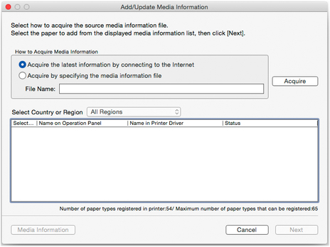 Specificare il file delle informazioni sul supporto ottenuto selezionando Acquisisci specificando il file delle informazioni sulla carta (Acquire by specifying the media information file), facendo clic sul pulsante Acquisisci (Acquire) e specificando il file nella finestra di dialogo Apri (Open).