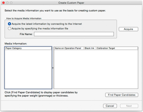 Specificare il file delle informazioni sul supporto ottenuto selezionando Acquisisci specificando il file delle informazioni sulla carta (Acquire by specifying the media information file), facendo clic sul pulsante Acquisisci (Acquire) e specificando il file nella finestra di dialogo Apri (Open).