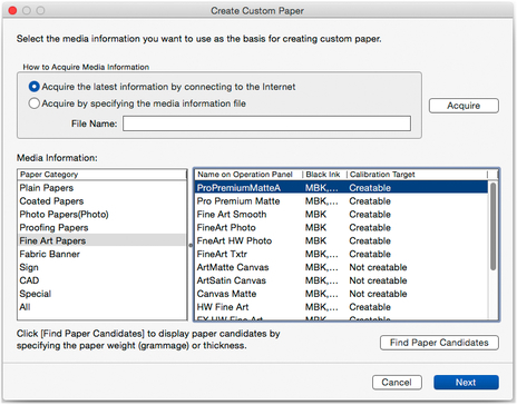 Ottenere il file delle informazioni sul supporto dal sito Web di Canon usando un computer connesso a Internet. Non è possibile ottenere un file delle informazioni sul supporto esportato con Media Configuration Tool (Vedere "Esportazione delle informazioni sul supporto.").
