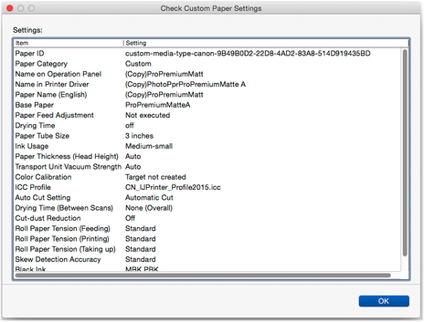 Verificare le impostazioni della carta personalizzata e fare clic sul pulsante OK.