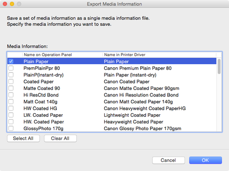 Select the paper you need from the media information registered in the base printer, export to a file, and save it.