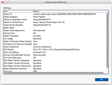 • The information that will appear in the Simple Paper Reference dialog box is media information sent by the Media Configuration Tool. After updating the media information with the Media Configuration Tool, check the printer control panel to verify the media information values that were changed in the printer control panel.