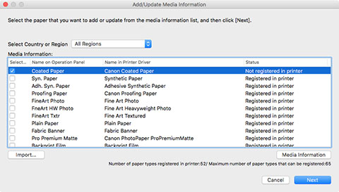 I file delle informazioni sul supporto scaricati dal sito web di Canon e quelli esportati da Media Configuration Tool possono essere importati e applicati alle stampanti.