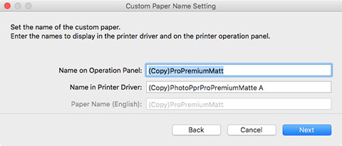 A continuación, especifique el nombre del papel y agréguelo a la impresora como papel personalizado.
