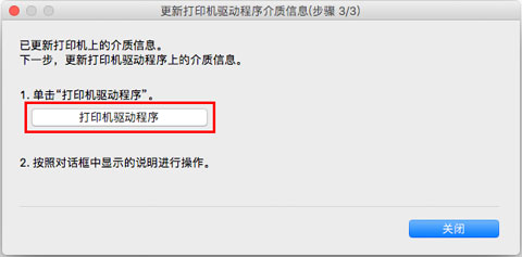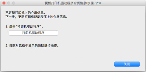 如果已成功更新打印机的介质信息,则会显示更新打印机驱动程序介质信息屏幕。