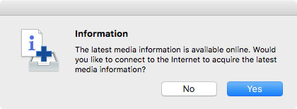 Fare clic sul pulsante Sì (Yes) per acquisire le informazioni sul supporto. Viene visualizzata la finestra di dialogo Aggiunta/Aggiornamento informazioni sulla carta (Add/Update Media Information) ed è possibile controllare le informazioni sul supporto più recenti.