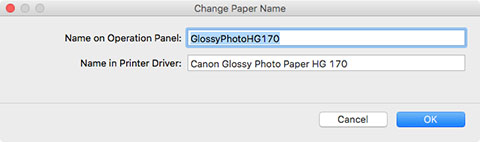 (Cambia nome carta (Change Paper Name)) nel gruppo di pulsanti Mod.inf. carta (Edit Media Information) (oppure selezionare Cambia nome carta (Change Paper Name) dal menu Mod.inf. carta (Edit Media Information)).Viene visualizzata la finestra di dialogo Cambia nome carta (Change Paper Name).