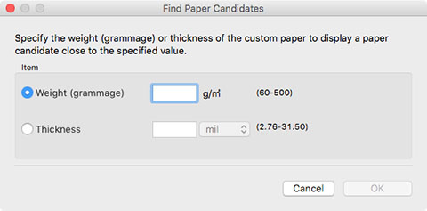 Em Categoria do papel (Paper Category), selecione outra opção que não Tudo (All) e, em seguida, clique no botão Localizar papel (Find Paper). Na caixa de diálogo Localizar papel (Find Paper), defina Peso (gram.) (Weight (grammage)) ou Espessura (Thickness) e, em seguida, clique no botão OK.