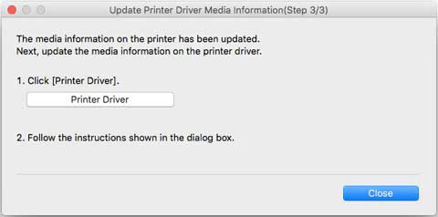 If the media information is successfully updated for the printer, the Update Printer Driver Media Information screen appears.