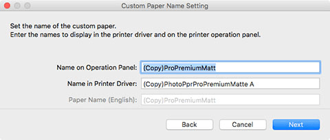 Откроется диалоговое окно Значение названия специальной бумаги (Custom Paper Name Setting).