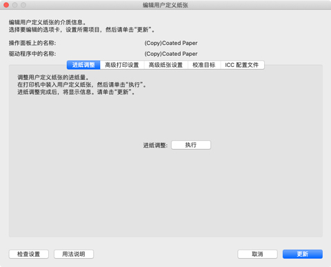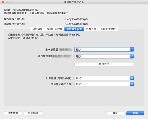 设置校准目标和ICC 配置文件选项卡后,对高级纸张设置选项卡中的墨水使用量的更改会禁用校准目标和ICC 配置文件选项卡中的设置。 在这种情况下,请重新设置校准目标和ICC 配置文件选项卡。
