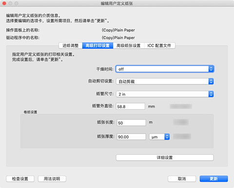 在这种情况下,在编辑用户定义纸张对话框的高级打印设置选项卡中,将自动剪切设置设置为手动剪切。