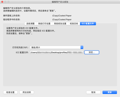 如果要编辑的用户定义纸张已有合适的ICC配置文件,请单击浏览按钮,然后选择该ICC配置文件。