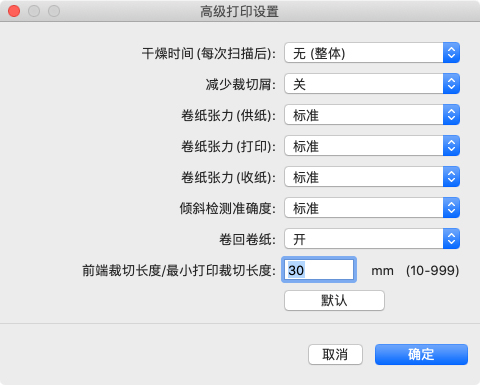 将前端裁切长度/最小打印裁切长度的值设置为小于默认值可能会在弹出纸张时引起问题。
