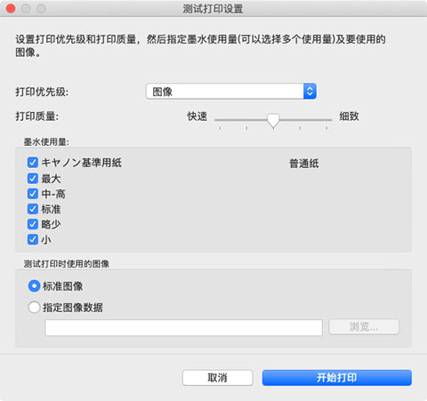 选择测试打印的墨水用量。 Canon 基准纸张是选为用户定义纸张的基准纸张的墨水用量。