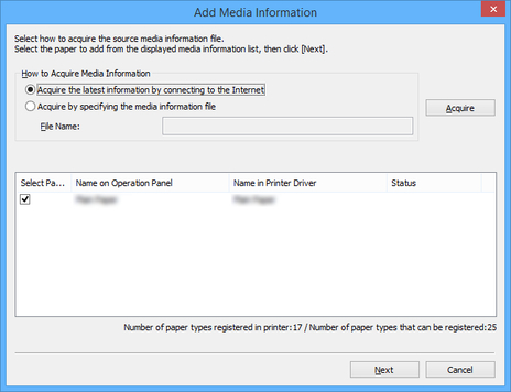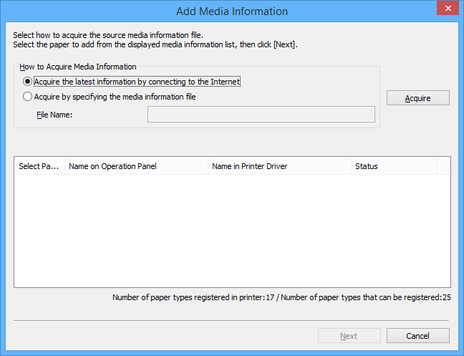 Specify the media information file that you obtained by selecting Acquire by specifying the media information file, clicking the Acquire button, and specifying the file in the Open dialog box.