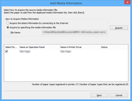Select Acquire by specifying the media information file, and then click the Acquire button.