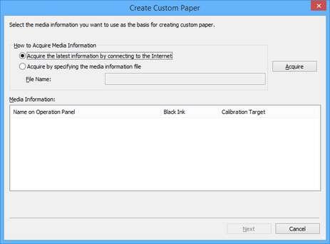 Specify the media information file that you obtained by selecting Acquire by specifying the media information file, clicking the Acquire button, and specifying the file in the Open dialog box.