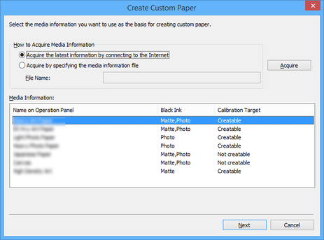 Select the media information that will be the basis for custom paper, and then click the Next button.