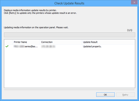 From the displayed printers, select the printers that you want to update the custom paper media information for at the same time as the base printer, and click the Execute button.
