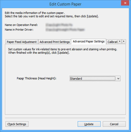 Specify the Paper Thickness (Head Height) in the Advanced Paper Settings sheet.