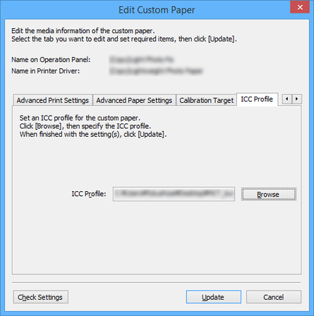 If a suitable ICC profile has been provided for the custom paper to be edited, click the Browse button, and select the ICC profile.