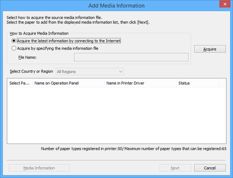 Specify the media information file that you obtained by selecting Acquire by specifying the media information file, clicking the Acquire button, and specifying the file in the Open dialog box.