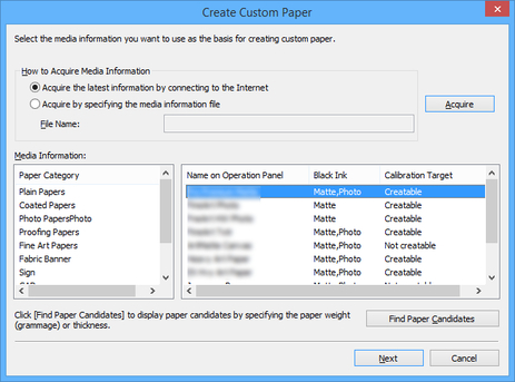 Select the media information that will be the basis for custom paper, and then click the Next button.