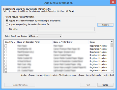 Specificare il file delle informazioni sul supporto ottenuto selezionando Acquisisci specificando il file delle informazioni sulla carta (Acquire by specifying the media information file), facendo clic sul pulsante Acquisisci (Acquire) e specificando il file nella finestra di dialogo Apri (Open).