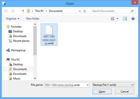 Select the saved media information backup file (.amb file), and then click the Open button.