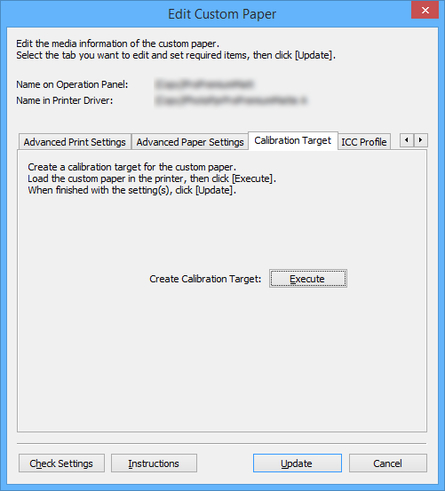 After setting the Calibration Target and ICC Profile sheets, changes to the ink usage on the Advanced Paper Settings sheet will disable the settings on the Calibration Target and ICC Profile sheets. In this case, set the Calibration Target and ICC Profile sheets again.