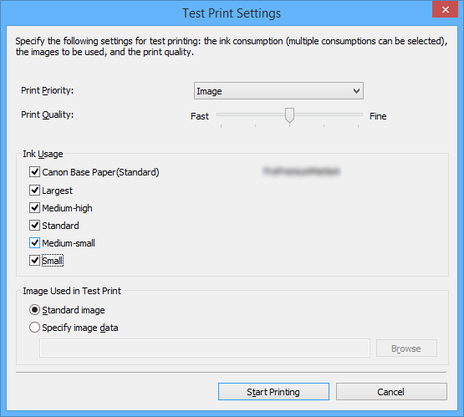 Select the ink usage level for test printing. Canon Base Paper is the ink usage for paper selected as the basis for the custom paper.