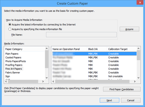 Specificare il file delle informazioni sul supporto ottenuto selezionando Acquisisci specificando il file delle informazioni sulla carta (Acquire by specifying the media information file), facendo clic sul pulsante Acquisisci (Acquire) e specificando il file nella finestra di dialogo Apri (Open).