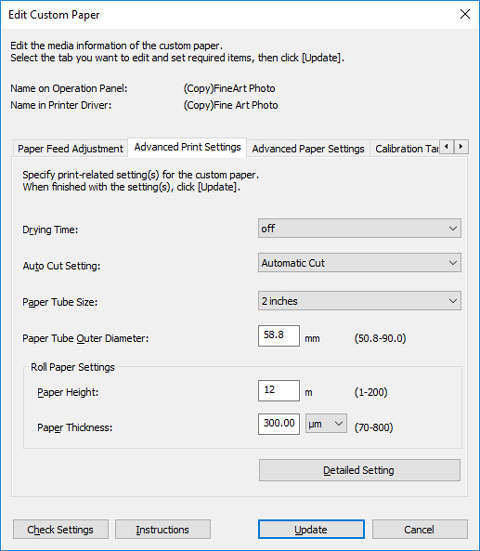 In questo caso, impostare Impostazione taglio automatico (Auto Cut Setting) su Taglio manuale (User Cut) nella scheda Impostazioni stampa avanzate (Advanced Print Settings) della finestra di dialogo Modifica carta personalizzata (Edit Custom Paper).