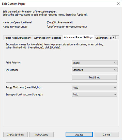 Modificare la carta personalizzata nella finestra di dialogo Modifica carta personalizzata (Edit Custom Paper) seguendo l'ordine sottoindicato.