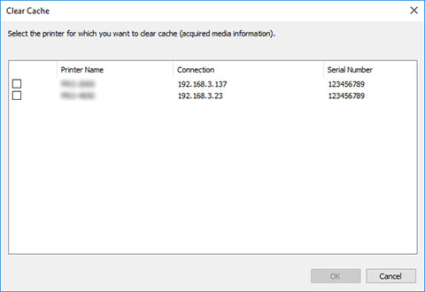 Consente di eliminare le cache delle informazioni sul supporto acquisite dalle stampanti di cui sono selezionate le caselle di controllo.