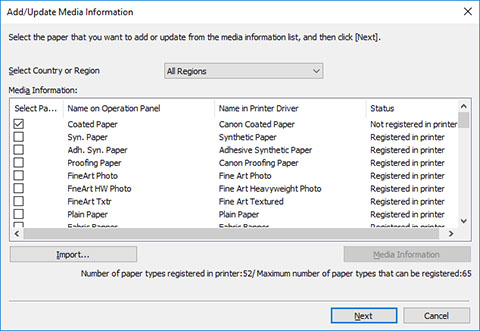 용지 정보 선택(Select Media Information) 화면에서 등록할 용지의 확인란을 선택합니다.