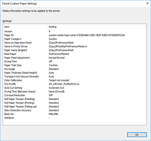 사용자 정의 용지 설정 확인(Check Custom Paper Settings) 대화 상자가 나타납니다.